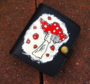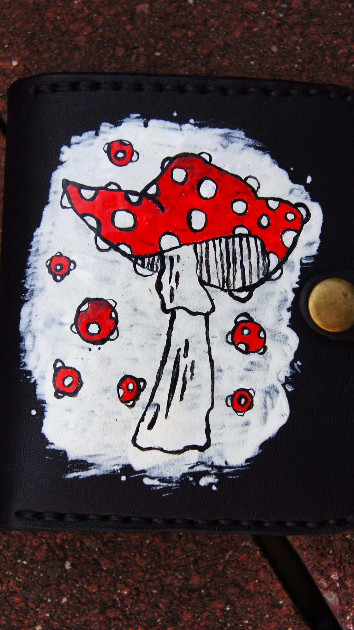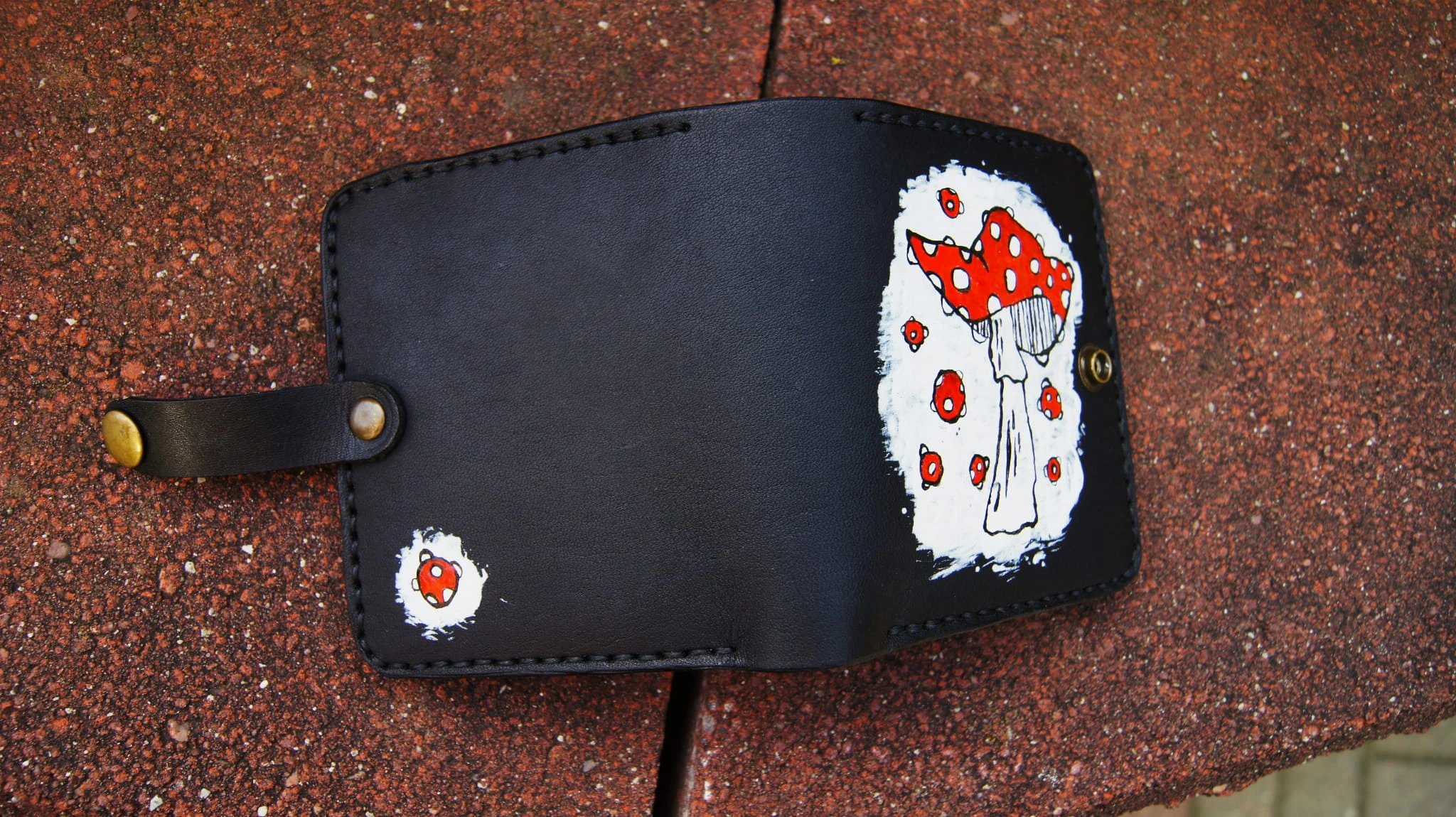 Ręcznie robiony portfel ze skóry naturalnej z namalowanym Muchomorem.