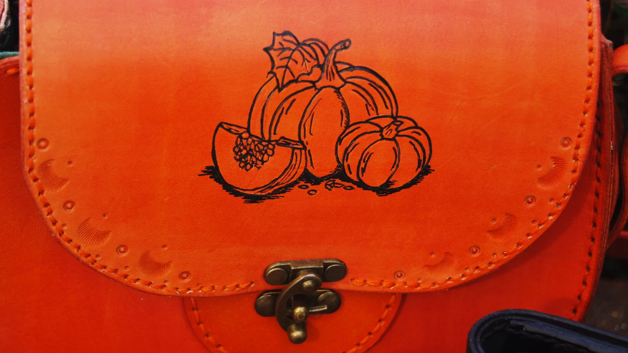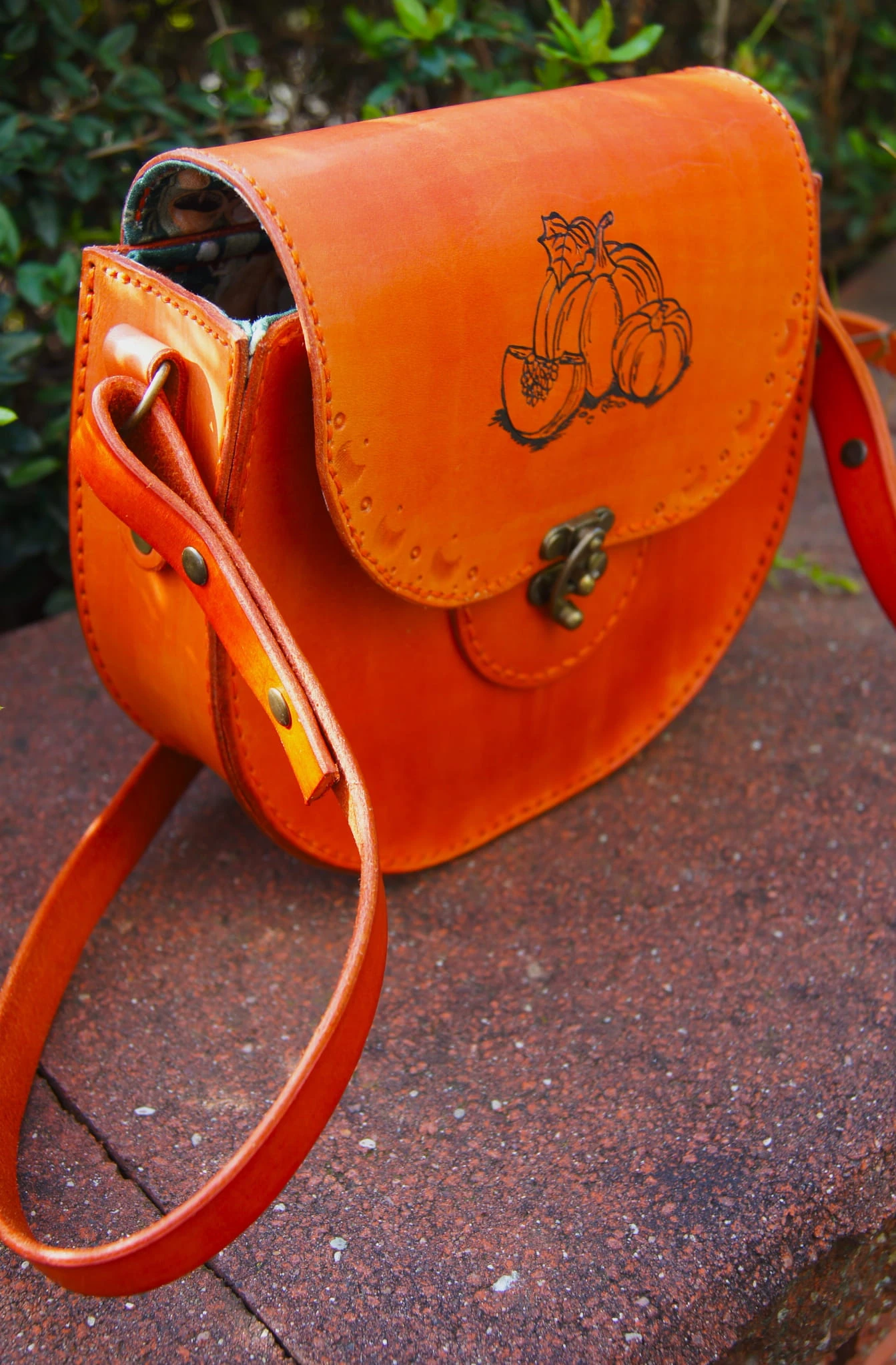 Motyw dyni, ręcznie malowany na klapie zahacza również delikatnie o Halloween,