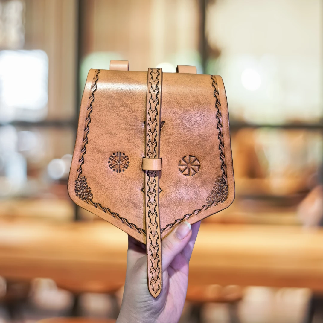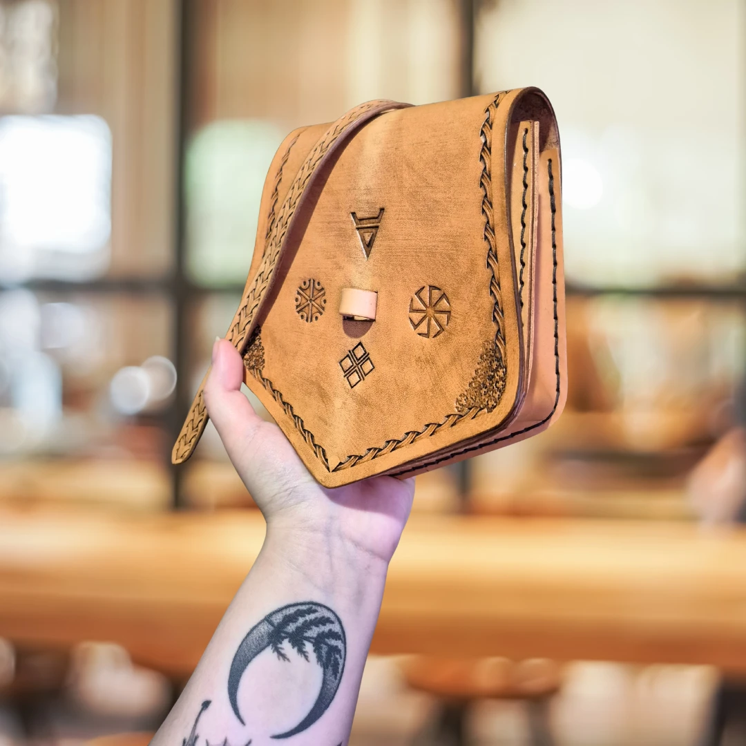 Ręcznie robiona kaletka ze skóry naturalnej ze słowiańskimi tłoczeniami.