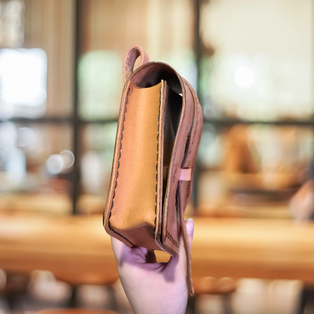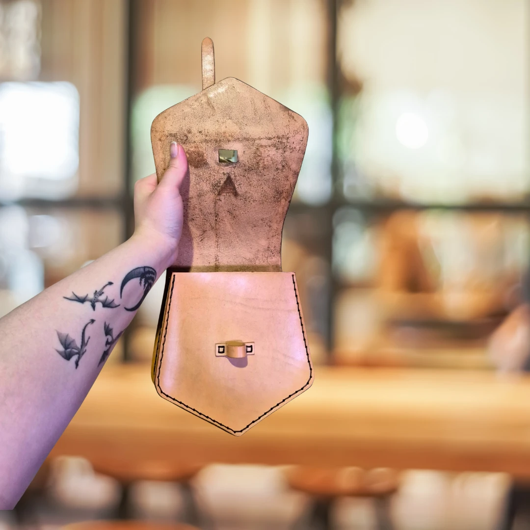 Kaletka została zrobiona z niemalowanej skóry, pokrytej pastą antykującą