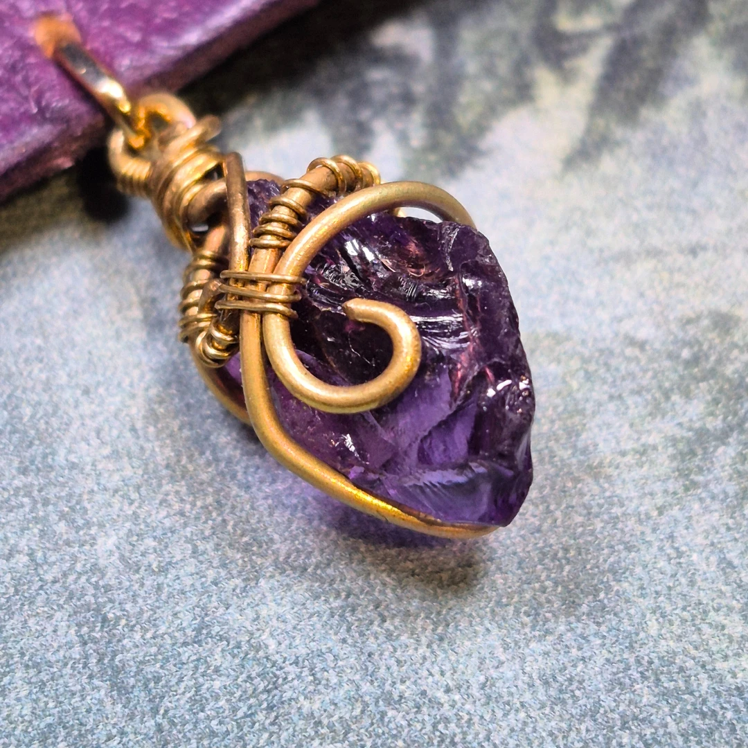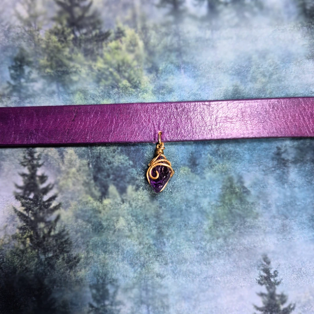 Ręcznie robiony skórzany fioletowy choker z ametystem oprawionym w mosiądz.