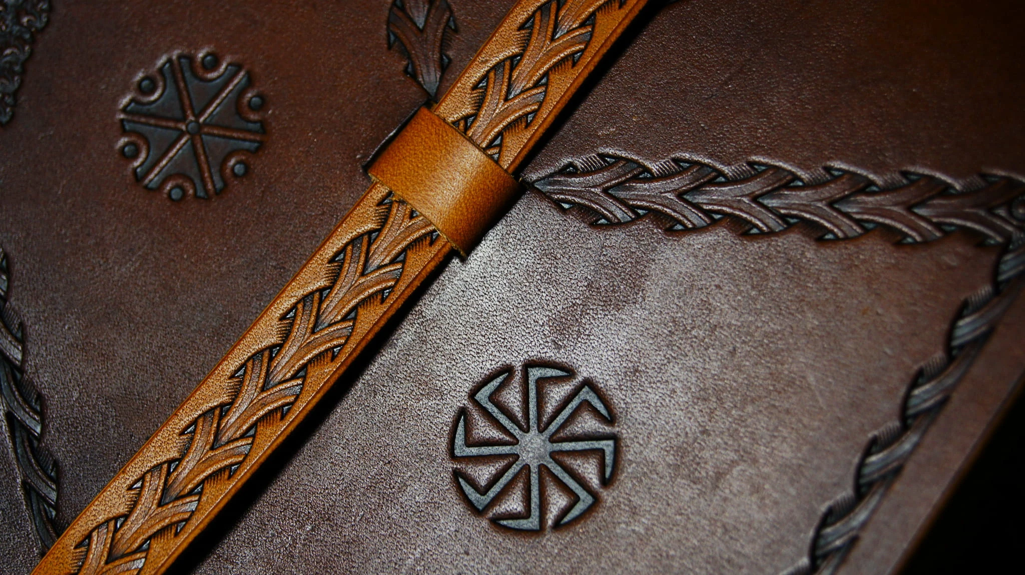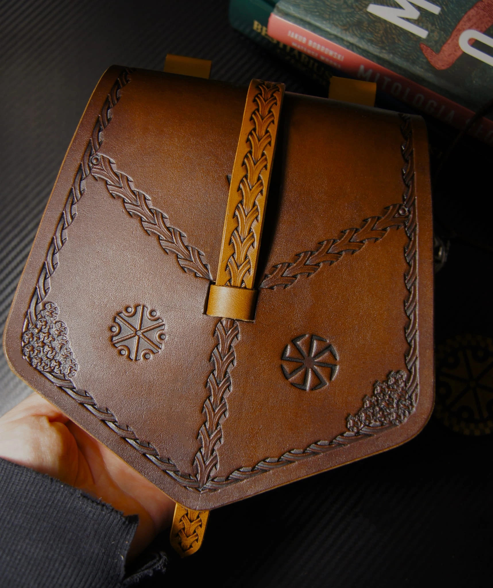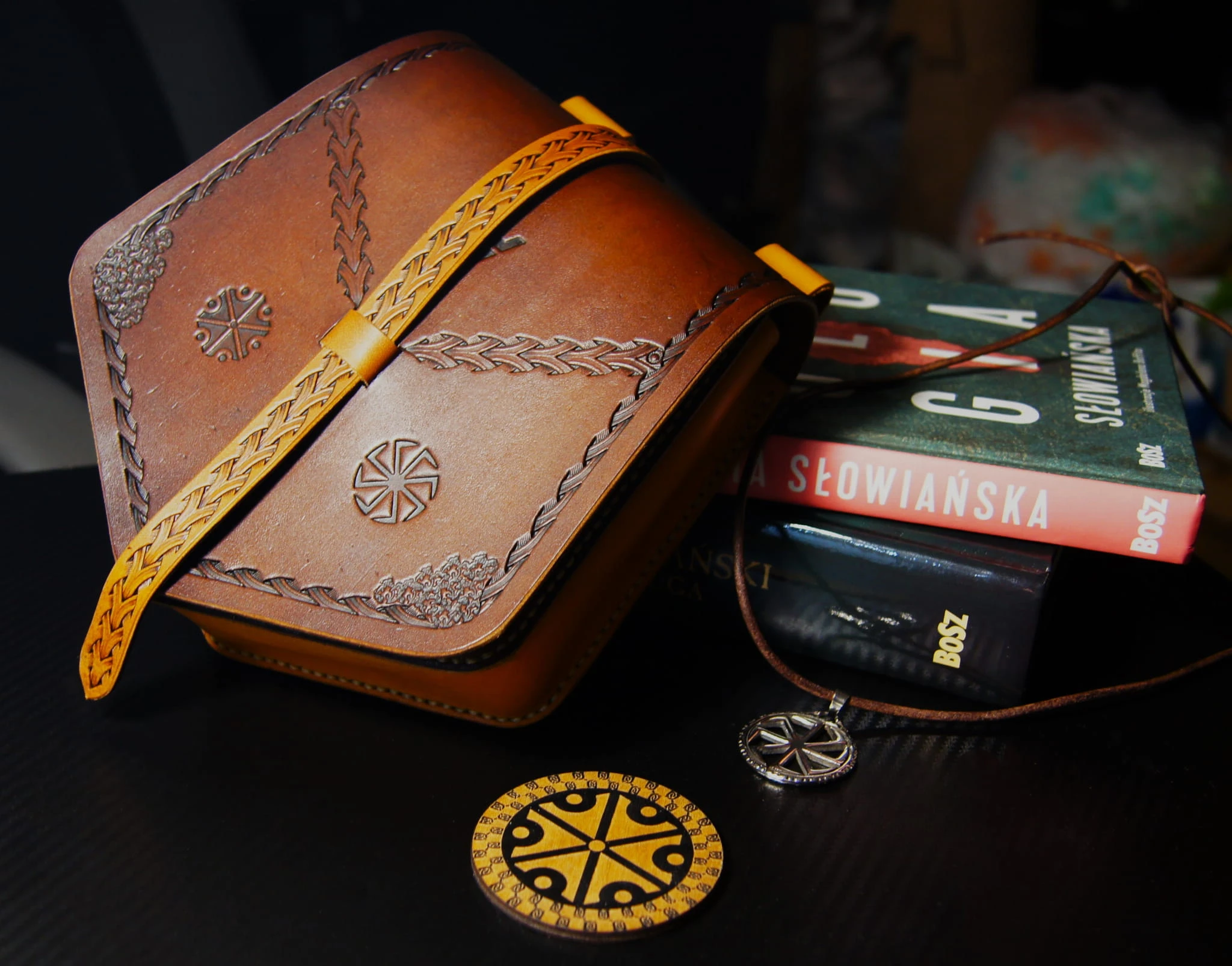Słowiańska tłoczona kaletka do paska BÓSTWA skóra naturalna