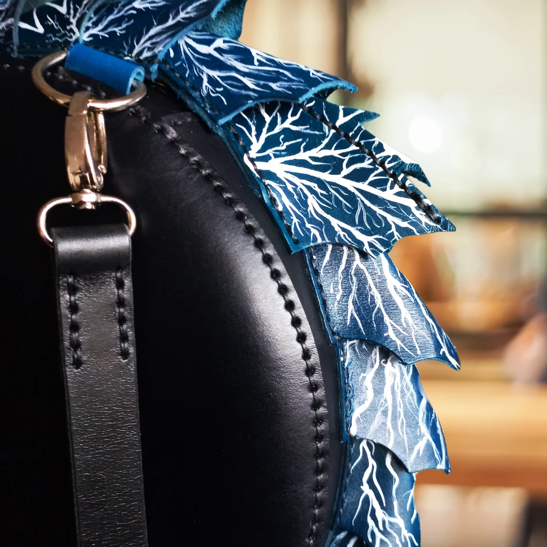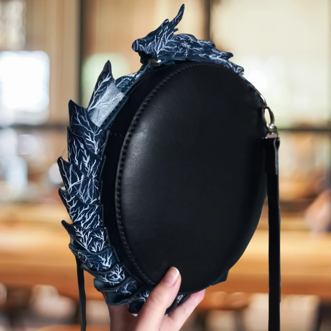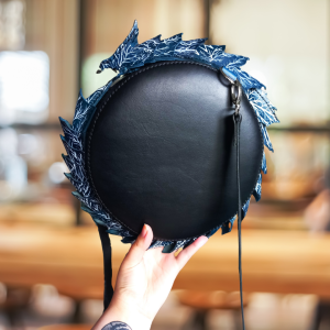 Torebka zapinana na zamek błyskawiczny ukryty pod połączeniem głowy z ogonem.
